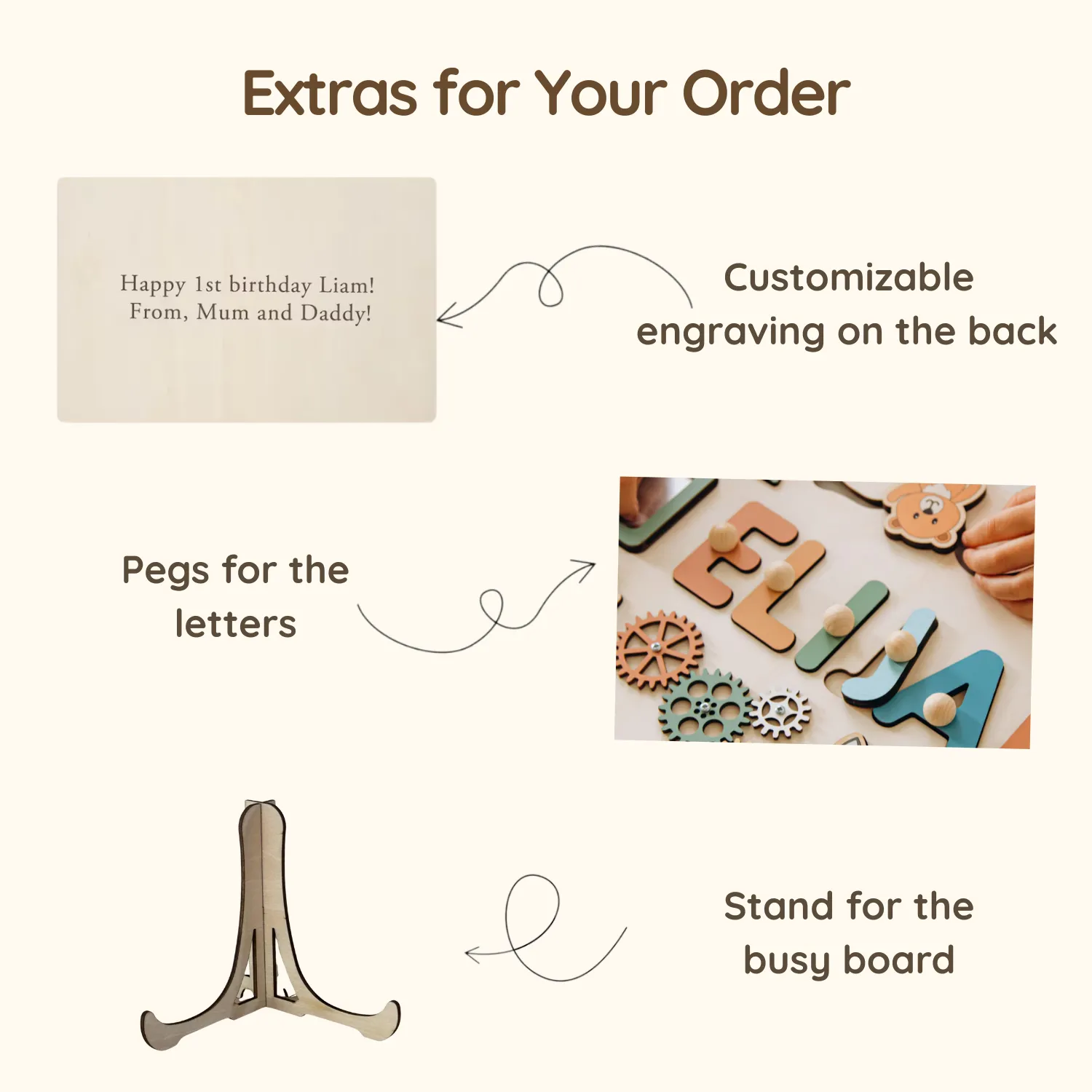 • Pegs: If you choose the “No Pegs” option, the pieces are designed to be tipped out. For children under 2, we recommend adding pegs for easier gripping.
