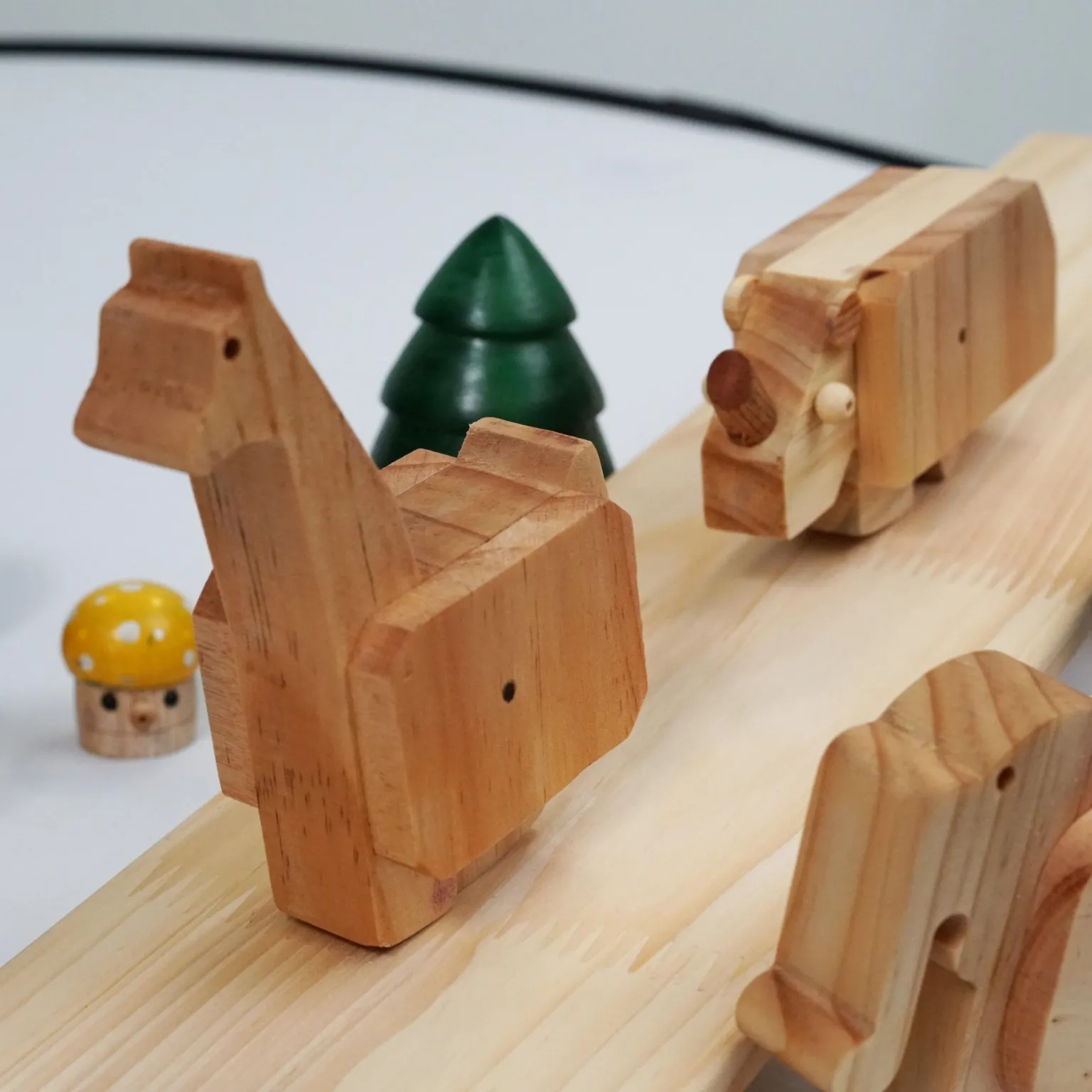 Carved from pure, unfinished wood, these chunky elephants showcase beautiful natural grain. No paint, no distractions—just the warm, honest texture of real wood. The set includes forest friends too: tiny green pine trees and colorful mushrooms transform the ramp into a woodland trail where elephants take their daily stroll.