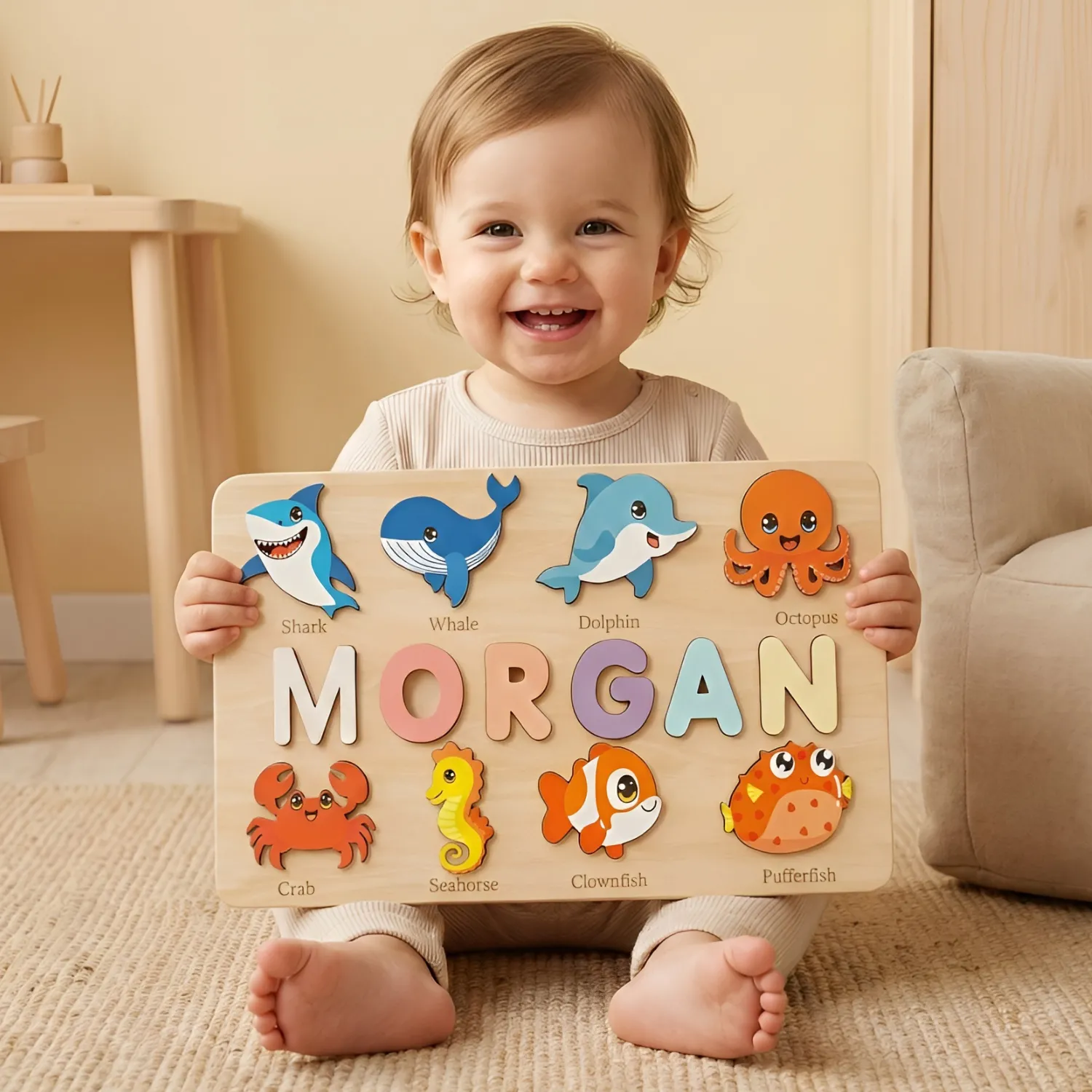 The ocean is a place of wonder for every child. The Kukoo™ Marine Animals – Wooden Montessori Name Puzzle brings the magic of the coral reef right into your playroom, making it the perfect baby shower or birthday gift.