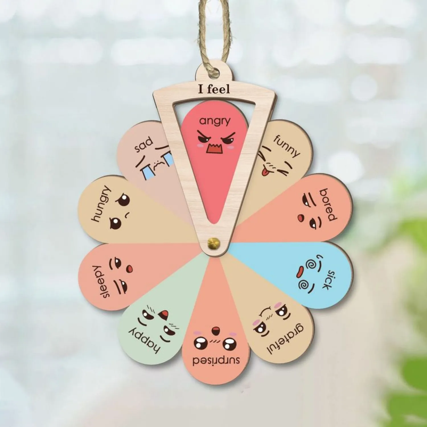 The Kukoo™ Montessori Emotions Feelings Chart Wheel transforms emotional check-ins into a gentle, playful ritual. A beautiful wooden Ferris wheel holds ten colorful emotion petals, each with an expressive face and a feeling name: happy, sad, angry, hungry, sleepy, surprised, grateful, funny, bored, sick. Spin the wheel, watch the feelings rotate, and stop when “I feel…” lands on the right one.
